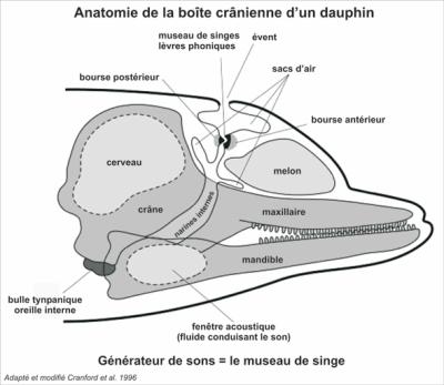 Une fois le son produit , il est réfléchi par la boite crânienne et concentré dans l'avant (ou melon) comme au travers d'une lentille convergente , afin de mieux se propager dans l'eau .